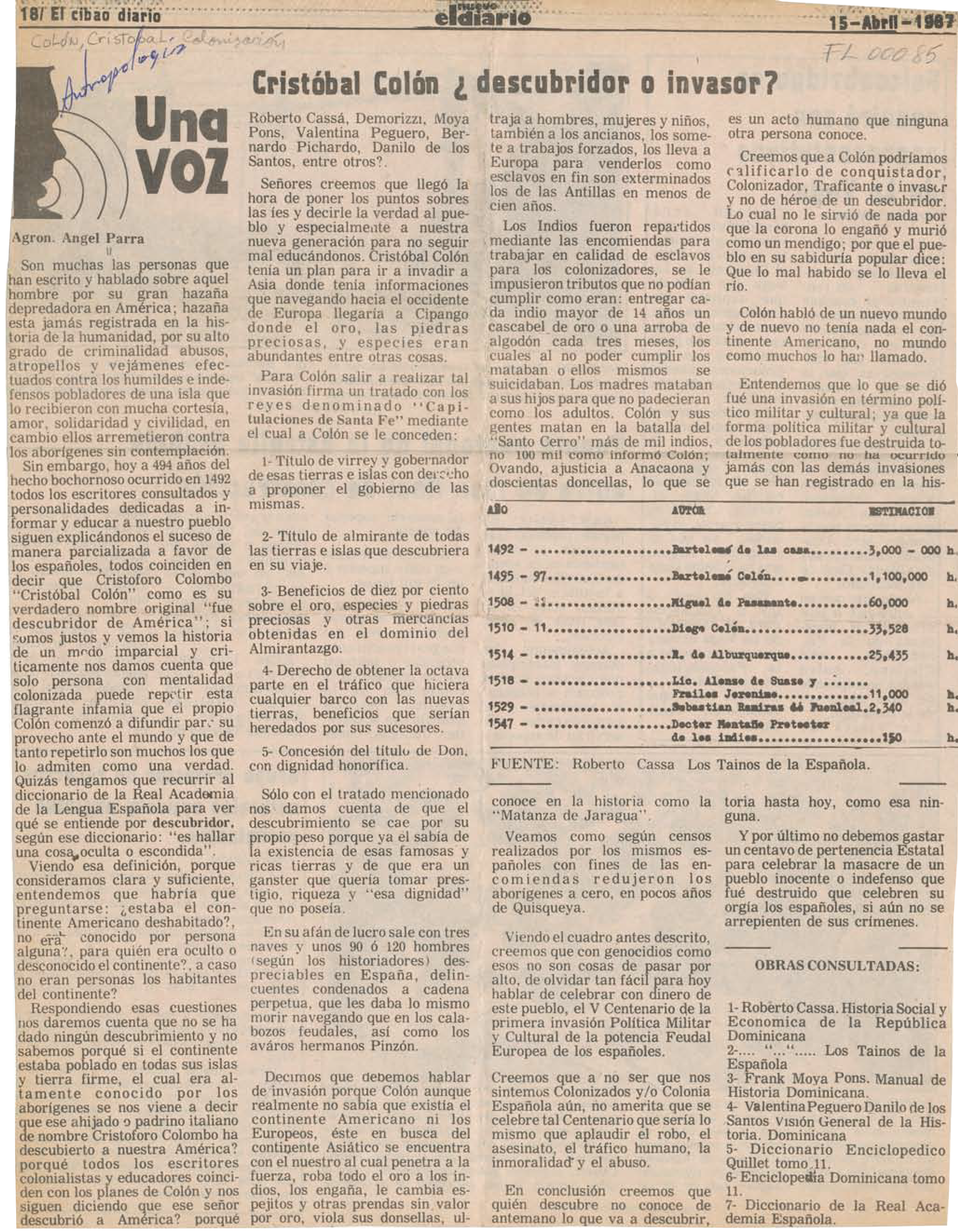 | Fig. 5 Cristóbal Colón ¿descubridor o invasor? / Angel Parra.-- p. 18.-- En: El Nuevo Diario.-- Santo Domingo (15 de abril, 1987) Colón, Cristóbal; Colonización |