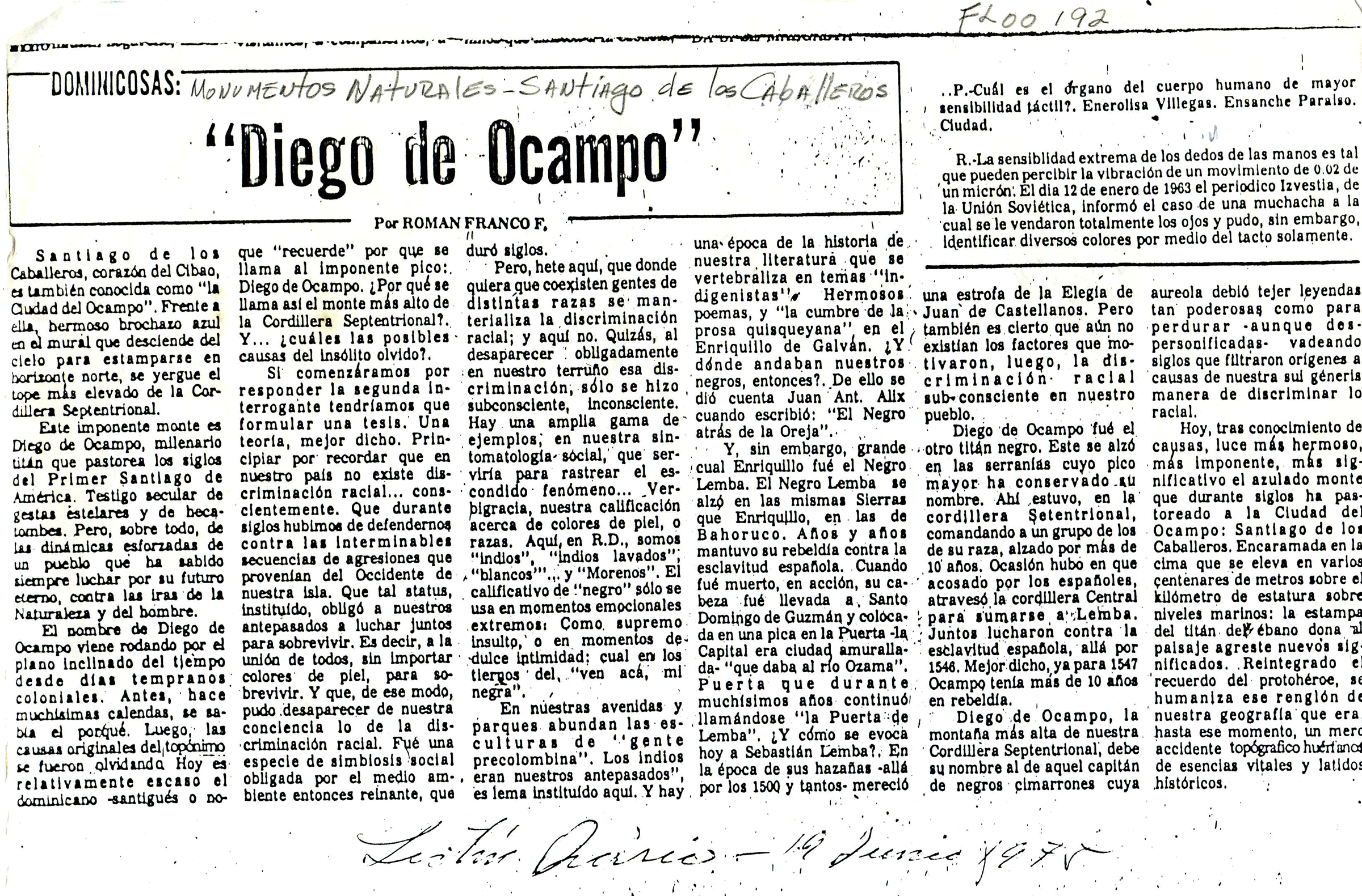 Diego de Ocampo / Román Franco Fondeur.-- En: Listín Diario.-- Santo Domingo (19 de junio, 1975)